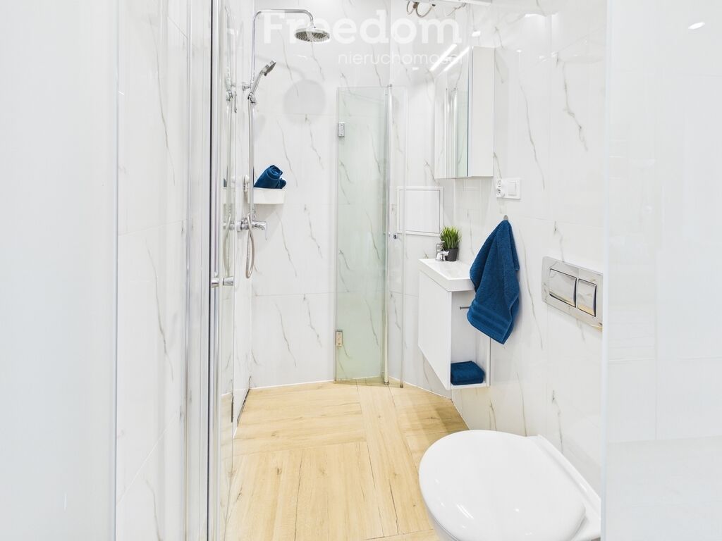 wygodną kabiną prysznicową i dużym lustrem a także toaletą.