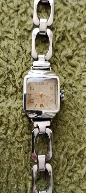 Oferuję oryginalny damski zegarek mechaniczny Zaria z okresu PRL. Kultowy radziecki design: kwadratowa koperta, srebrna ...